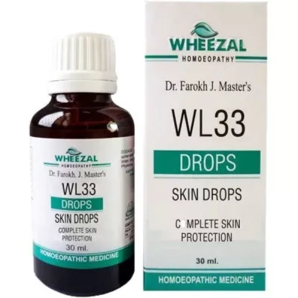 Dosage: Take 10-15 drops of Wheezal WL33 Skin Drop in little water four times a day before meals or as directed by the physician.