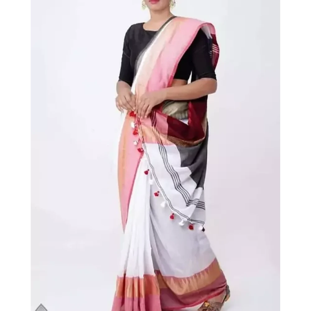 Shoppkarts Cotton Saree White Pink