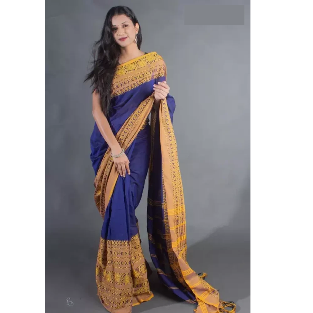 This saree is crafted from pure Cotton, a fabric known for its breathability, comfort, and texture. The Bengal cotton saree showcases the artistry of handloom weavers, providing a traditional touch to the ensemble. The pure Cotton material ensures a soft and comfortable feel, making it an ideal choice for all-day wear.