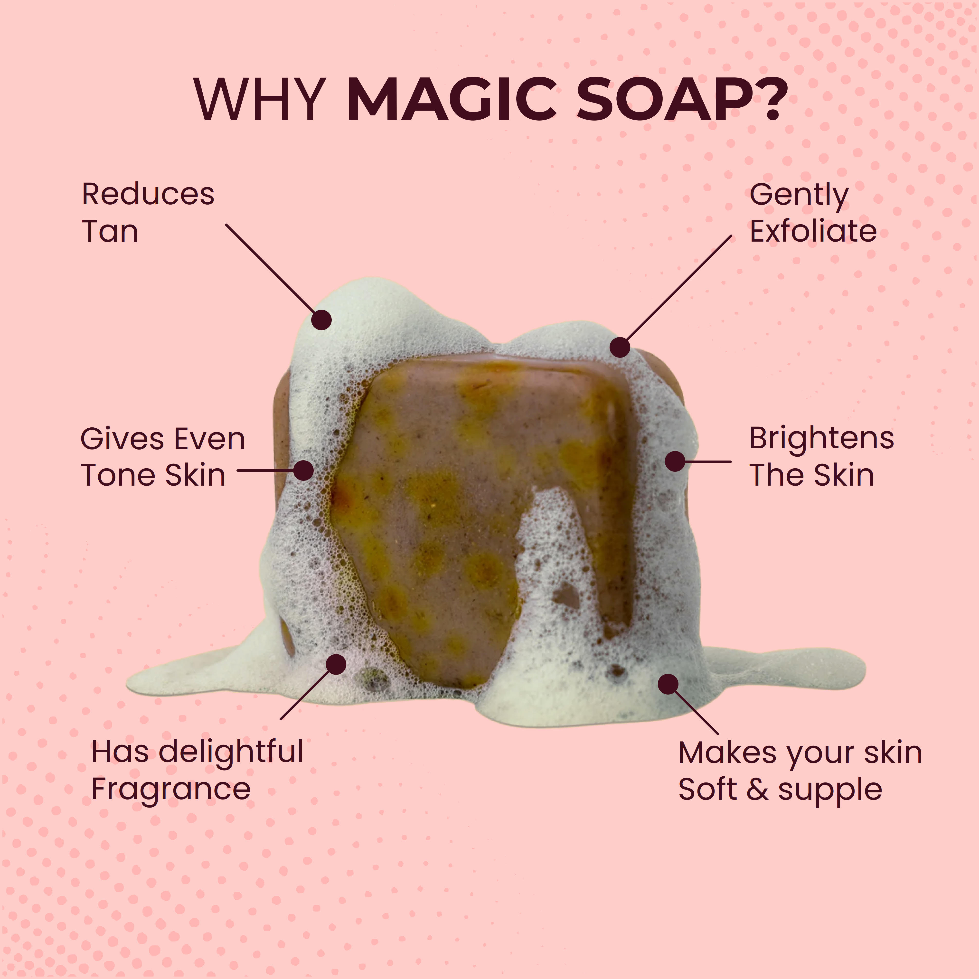 Magic Handmade Soap is specially crafted to give your skin a radiant and refreshed look. Enriched with natural brightening agents, this gentle cleansing bar works effectively to remove tanning, dullness, and impurities from the skin while maintaining its natural moisture. Ideal for both men and women, it enhances skin tone, smooths texture, and promotes a healthy glow with regular use. Free from harsh chemicals, this soap is suitable for all skin types and perfect for daily skincare. Let your skin feel nourished, soft, and visibly brighter—naturally.